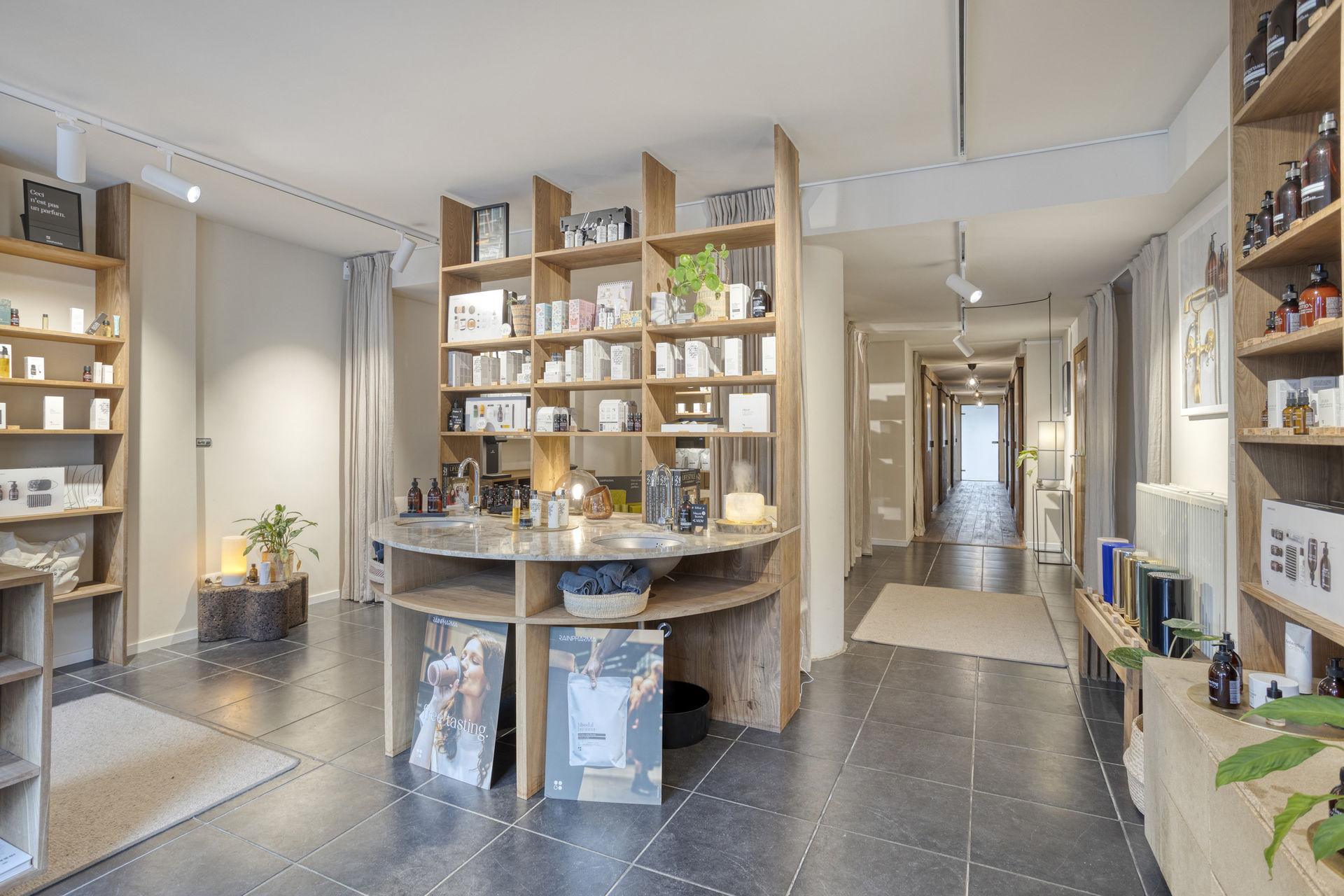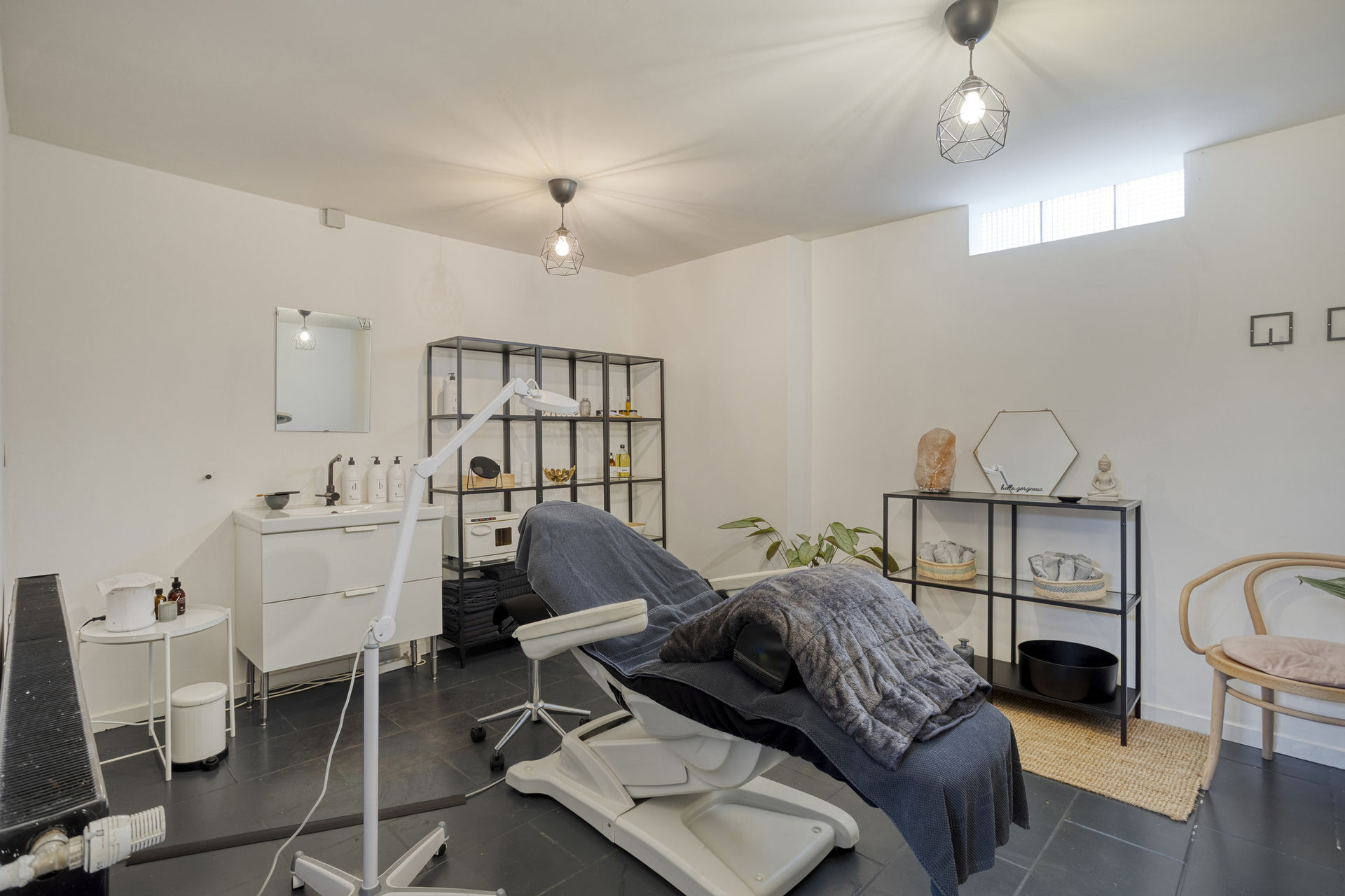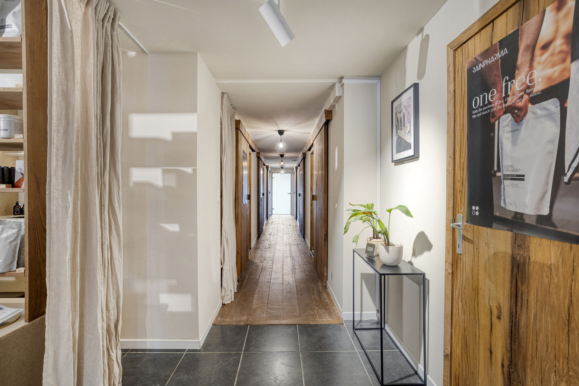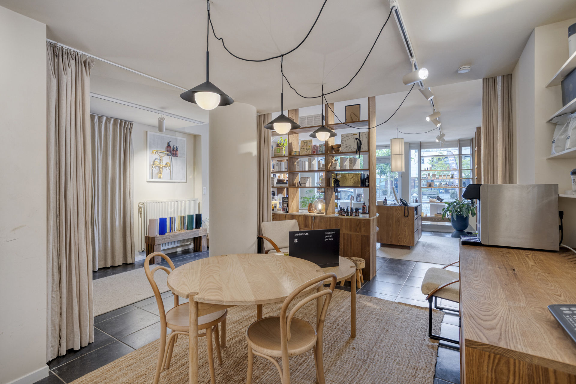 Inside, the layout includes a bright retail area with a kitchenette, several rooms suitable for offices or treatment spaces, a laundry area, practical cellars, and a private garden with a terrace – a true rarity in an urban environment.