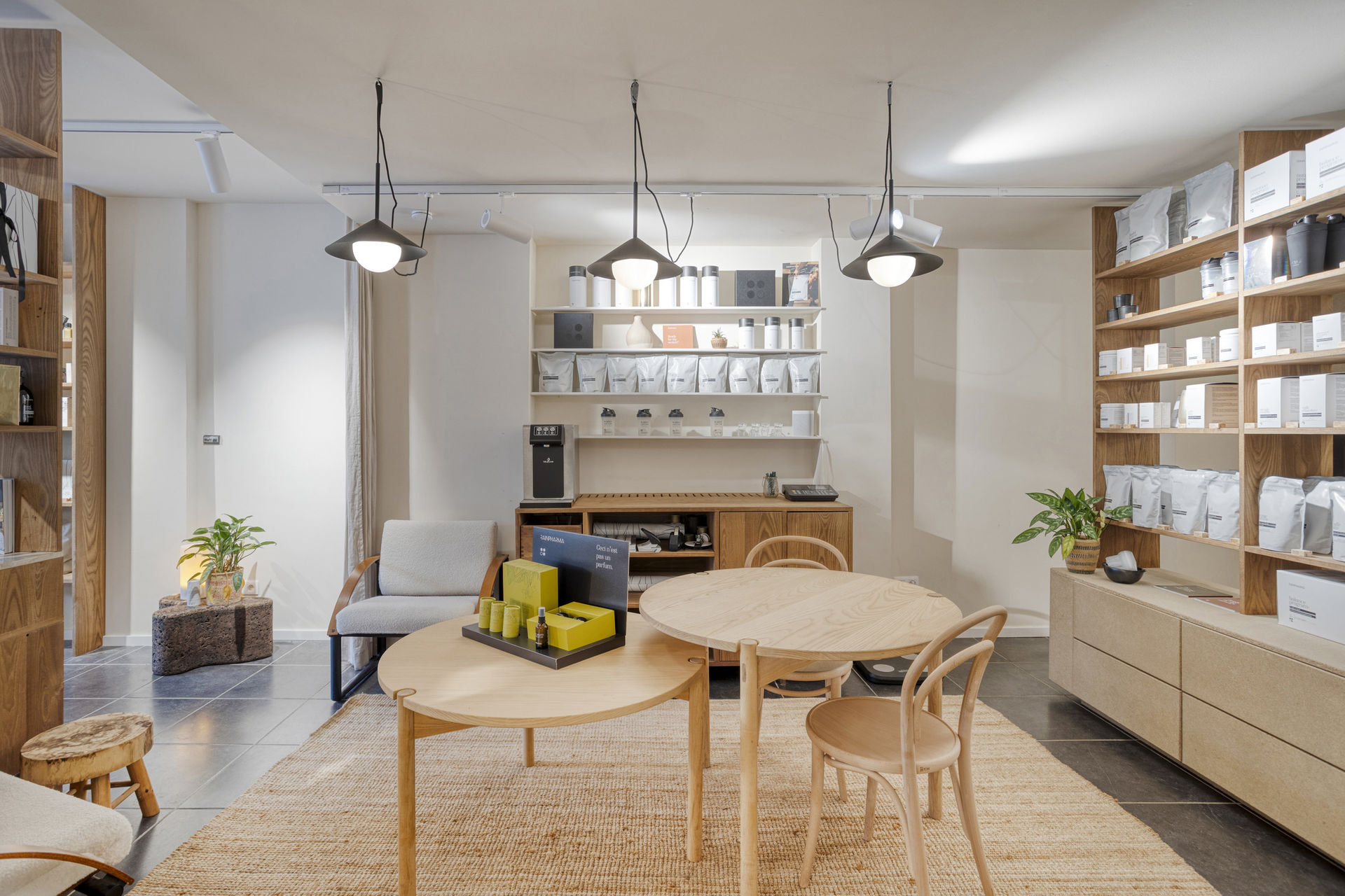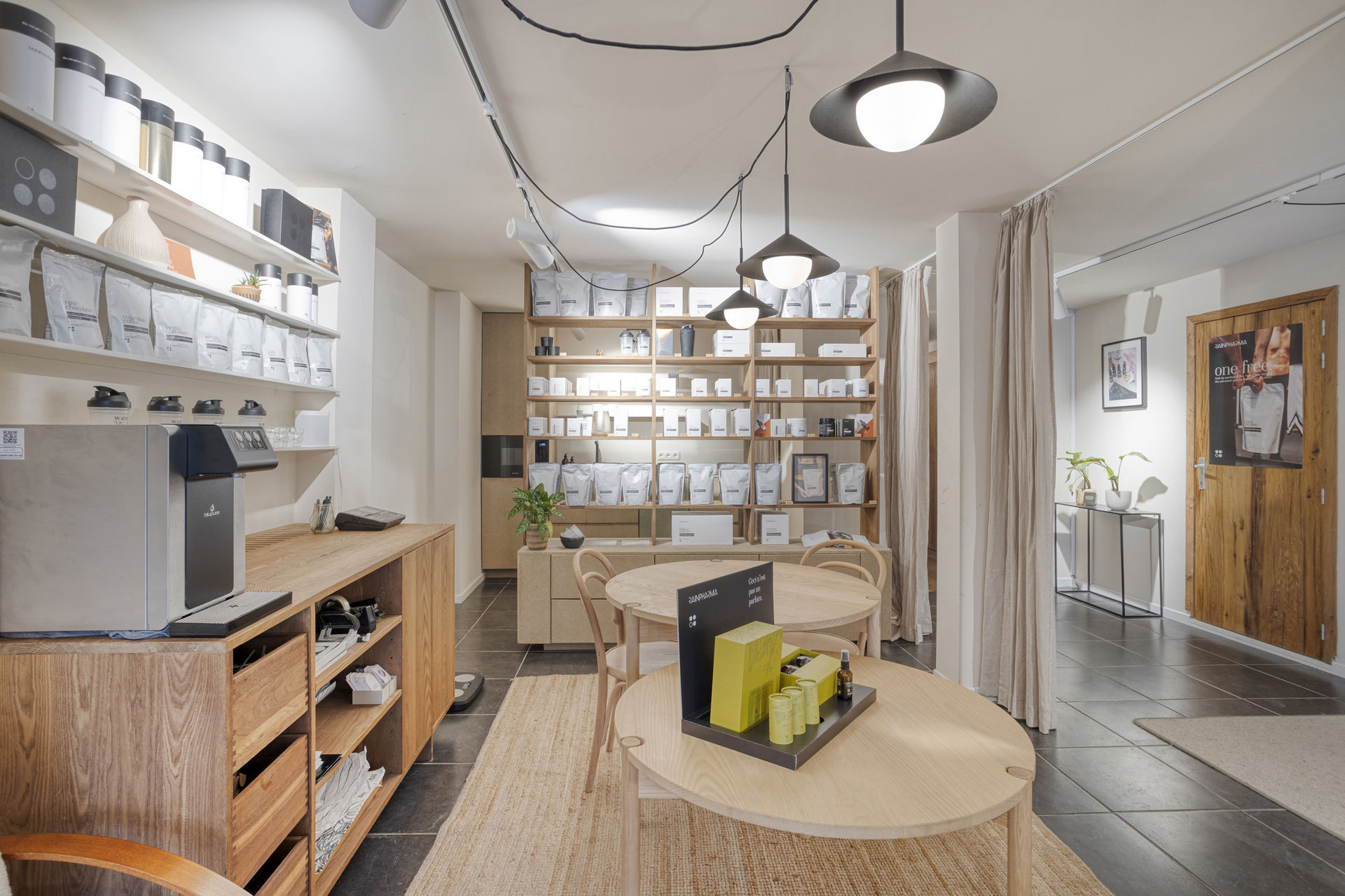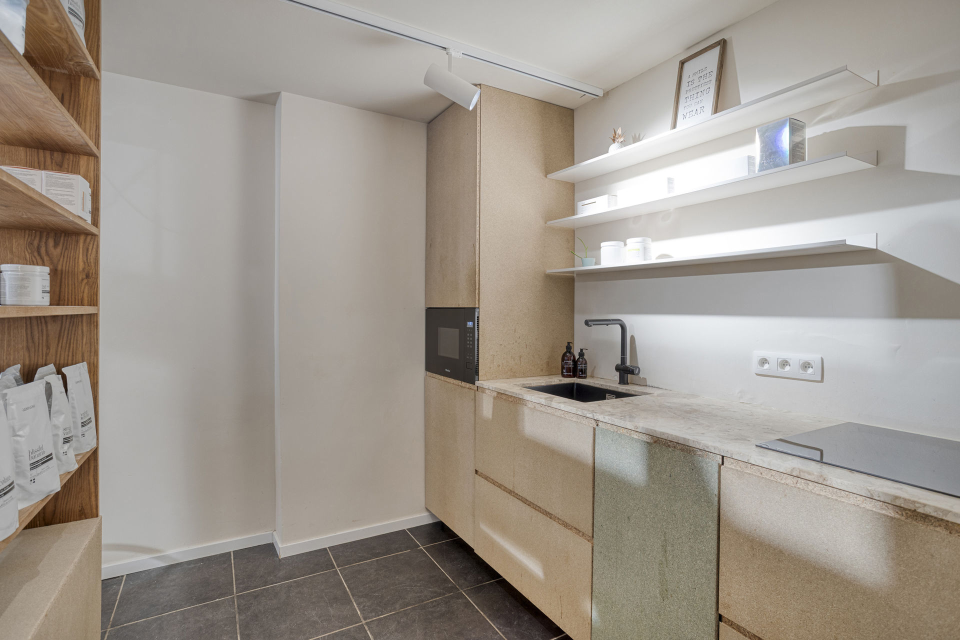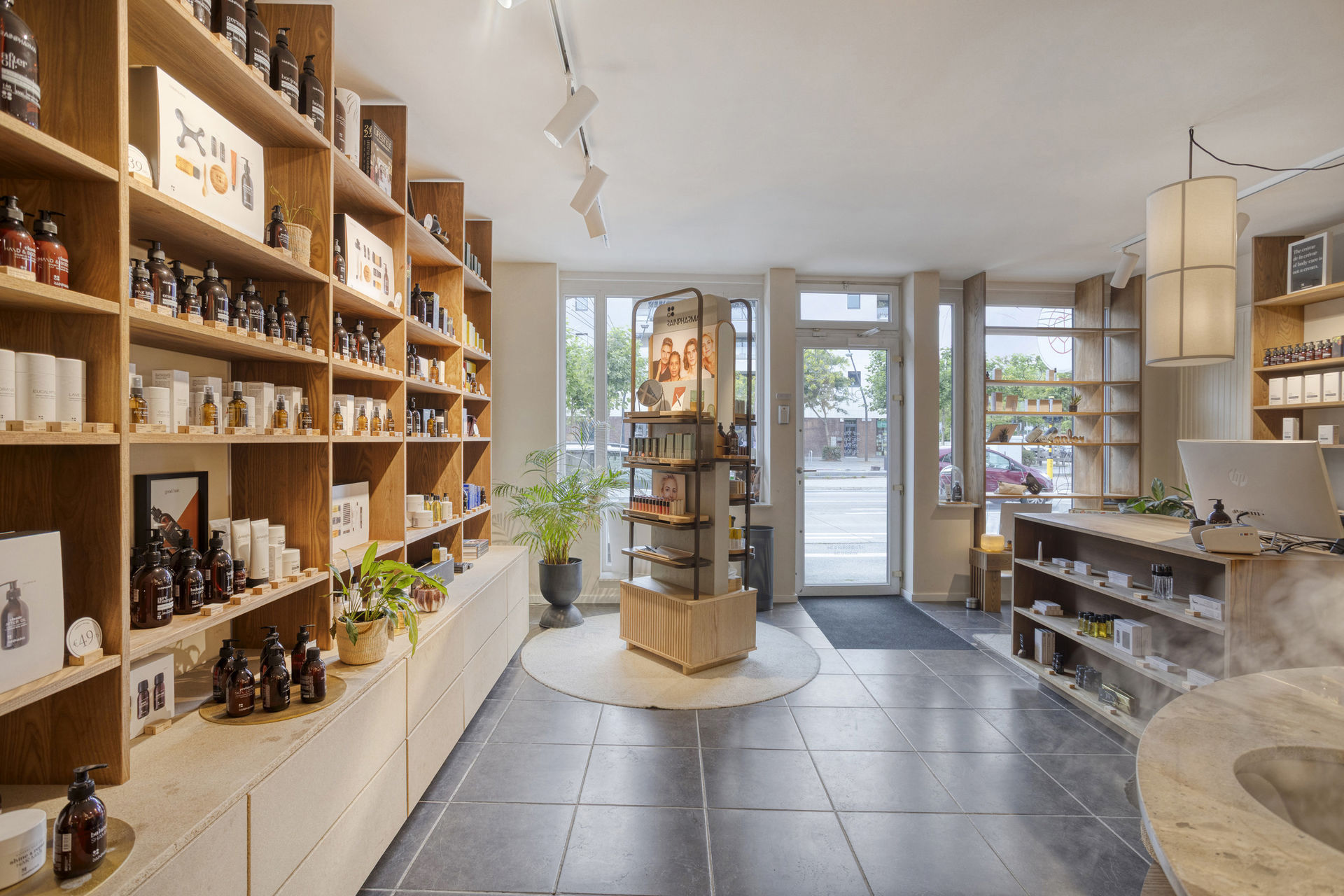 Inside, the layout includes a bright retail area with a kitchenette, several rooms suitable for offices or treatment spaces, a laundry area, practical cellars, and a private garden with a terrace – a true rarity in an urban environment.