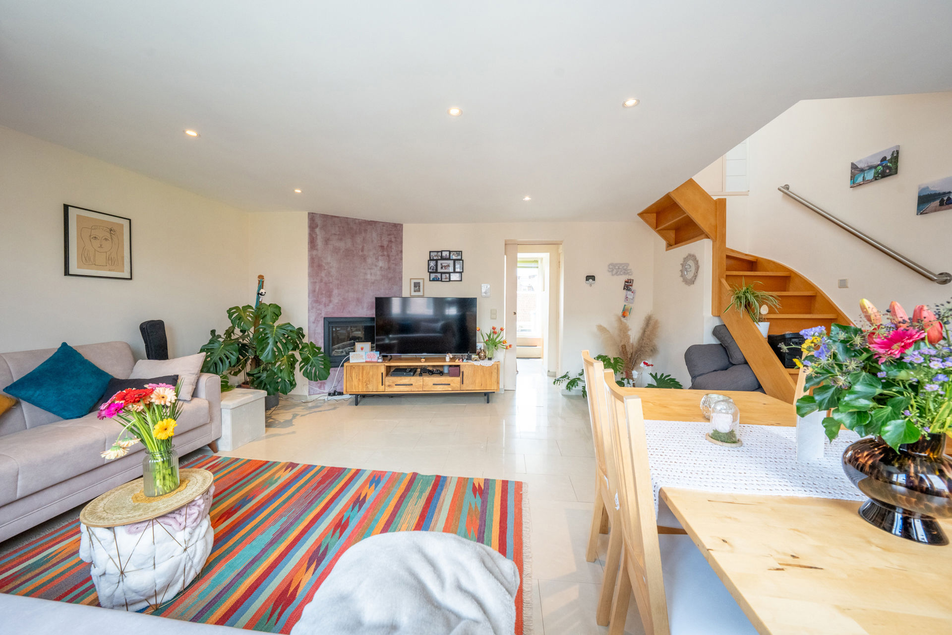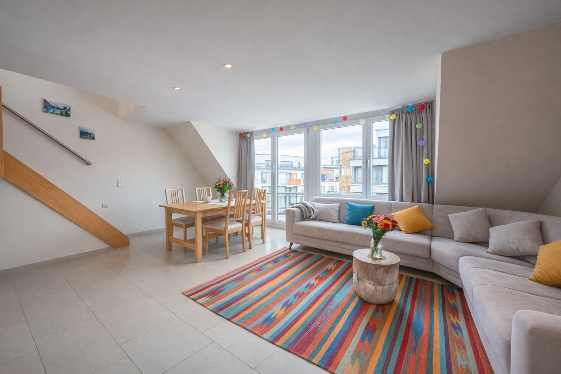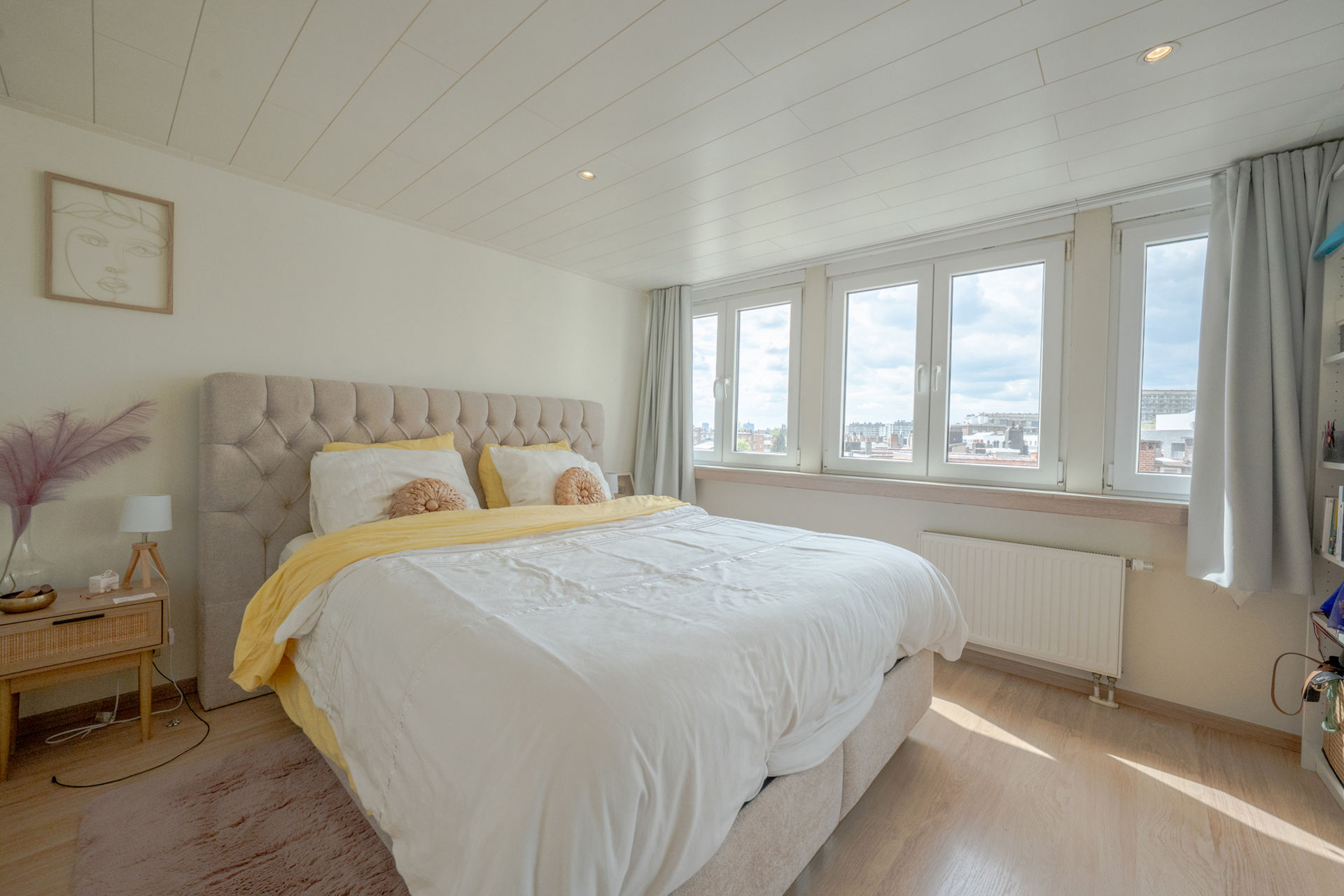 Evere: Beautiful renovated duplex of 80 m2 located in a quiet area close to shops, NATO, main roads and public transport. The apartment consists of an entrance hall with toilet, a living room with decorative open fire (28m2), a fully-equipped kitchen, a south facing terrace (11 m2). Upstairs one bedroom with dressing (11m2), a shower room with double sink and toilet. Individual gas heating (low consumption) + cellar. No common charges. Must see !!!