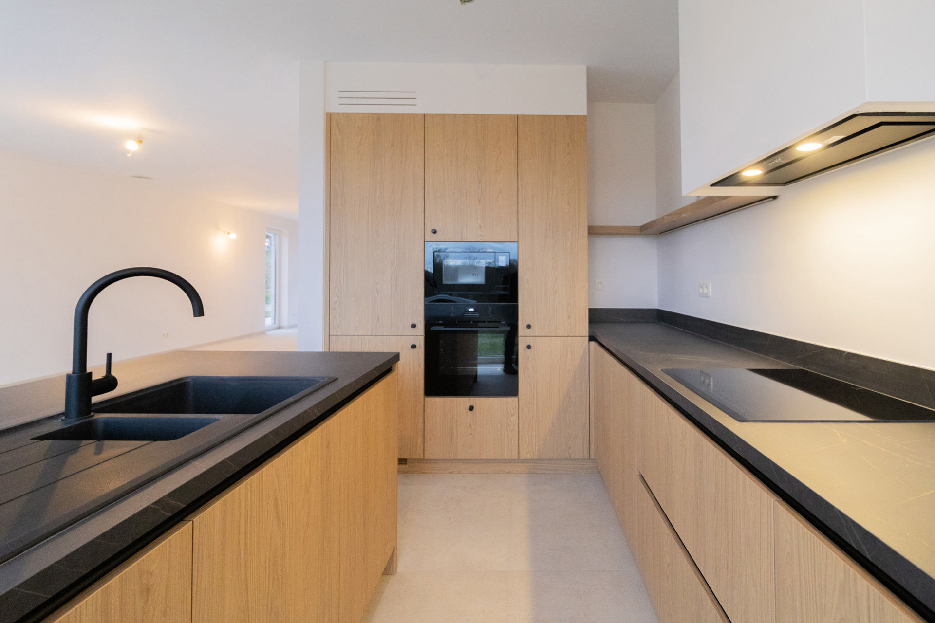 On the ground floor, the house is laid out as follows: an entrance hall with a separate toilet and space for a cloakroom, a beautiful and spacious living/dining area (total 48.5 m²) with adjoining fully equipped open kitchen with cooking island (12 m²), and adjoining the living area an open office corner (9 m²), a large separate storage/laundry room (9 m²), a beautiful and spacious terrace and access to the garden.