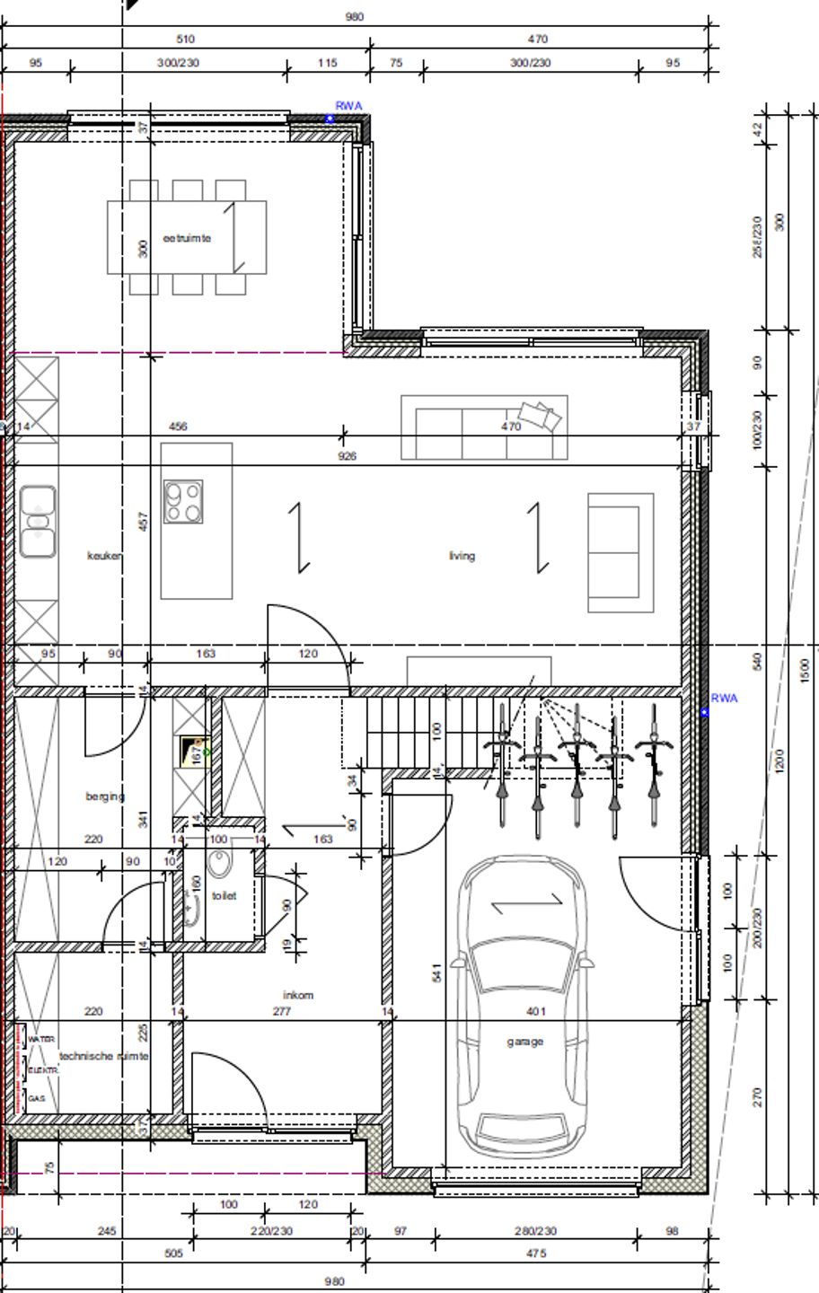 A large entrance hall with staircase and separate guest toilet, a spacious garage with additional space for bicycle storage, and a beautiful, large open-plan living and dining area (56 m²) featuring a fully equipped open kitchen with island. Adjacent to the kitchen is a separate storage/laundry room (8 m²) and an adjoining technical room (5 m²).