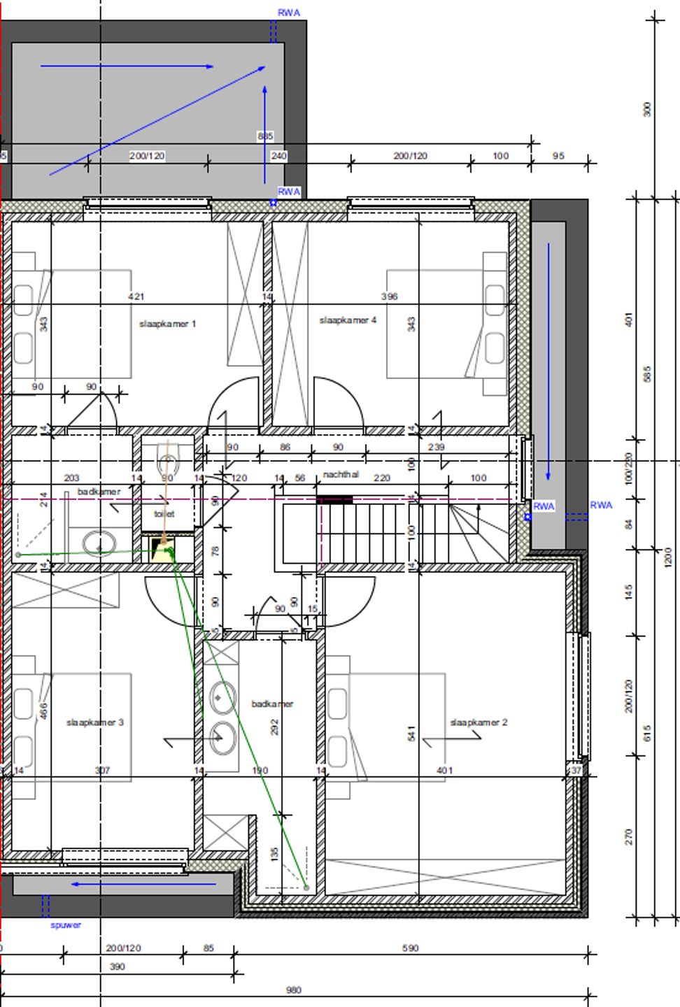 A spacious night hall with staircase, 4 large and attractive bedrooms (21.5 – 14.5 – 14.5 – 13.5 m²), a separate toilet, and 2 separate bathrooms. One bathroom is ensuite to a bedroom (4.5 m² with single washbasin and walk-in shower), and the main bathroom (7.5 m²) is equipped with a double washbasin and a large walk-in shower. The house is finished to a very high standard and has been designed with a strong focus on energy efficiency (heat pump, underfloor heating, 12 solar panels, E-level < E30).