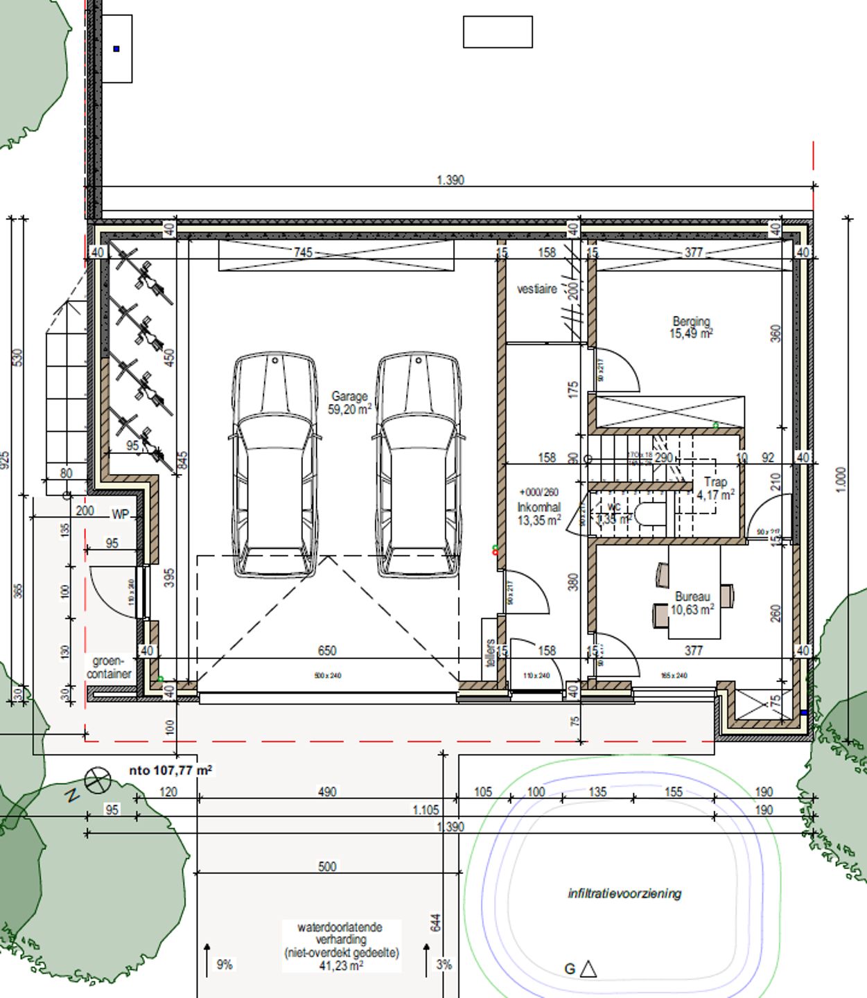 Spacious garage for 2 cars with additional storage (59 m²), entrance hall with cloakroom, separate toilet, office (11 m²) and large storage room (15.5 m²). Space for 2 additional cars in front of the garage. First floor: