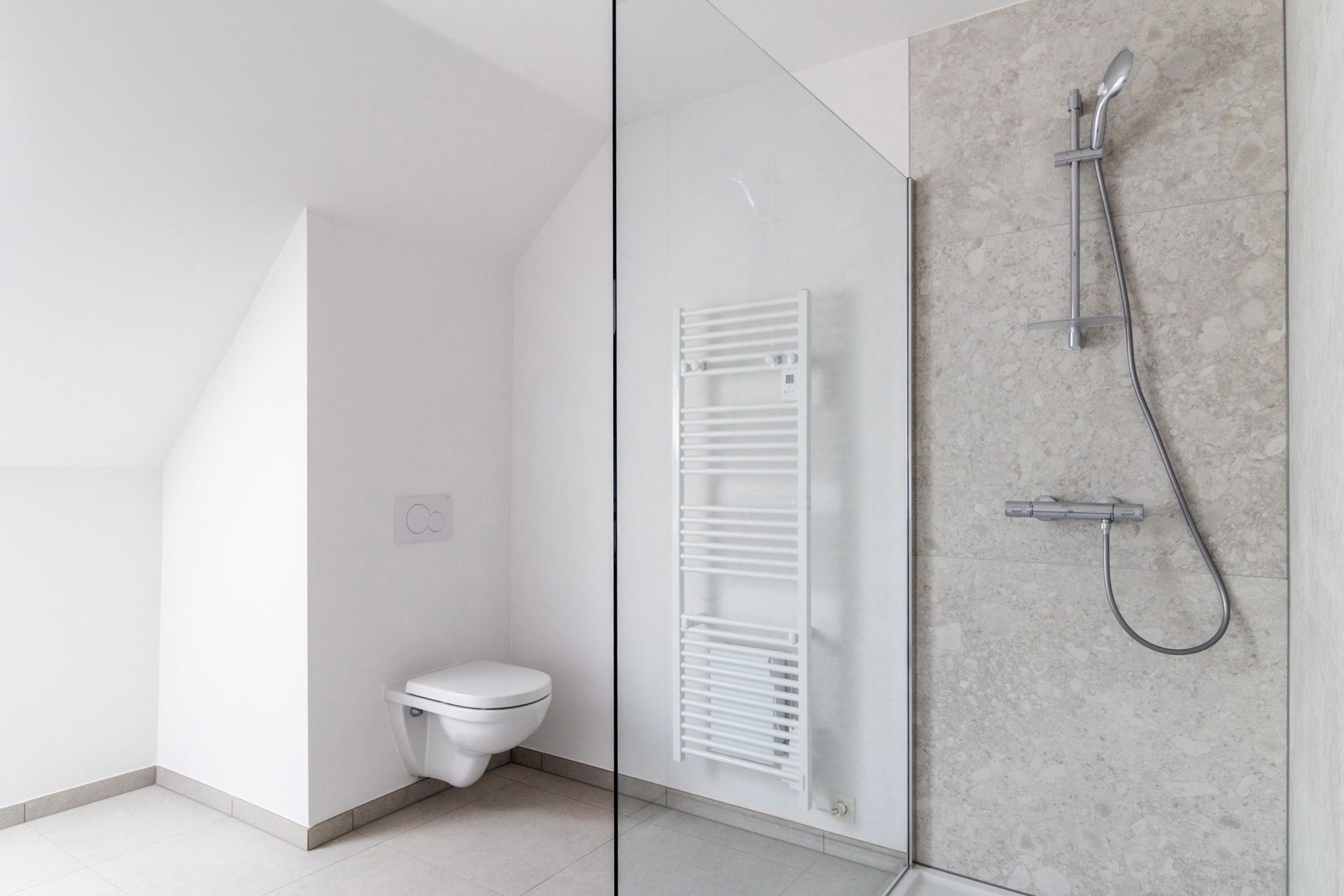 Second floor (partly under the roof slope): the master bedroom (32.5 m²) with fitted dressing wall and private bathroom (10 m² with toilet, walk-in shower and washbasin), and a separate storage room. The house is finished to a very high standard and designed to be highly energy-efficient (heat pump, underfloor heating, 12 solar panels, E-level < E30). It is fully completed and entirely painted, meaning it is ready for immediate occupancy. Land value: €225,000