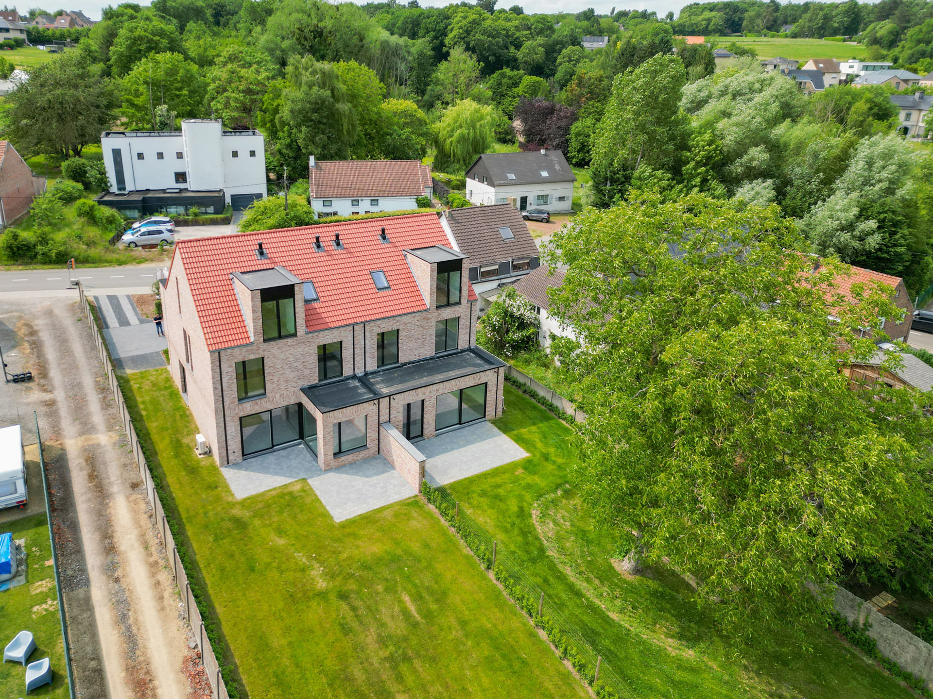 Huldenberg (Loonbeek): Very spacious newly built three-façade house (258 m² built surface area) with a total of 4 bedrooms and 2 offices, located on a beautiful and large plot of 21 ares 21 centiares, in a rural setting, with open green views on the garden side (east-facing). The layout is as follows: