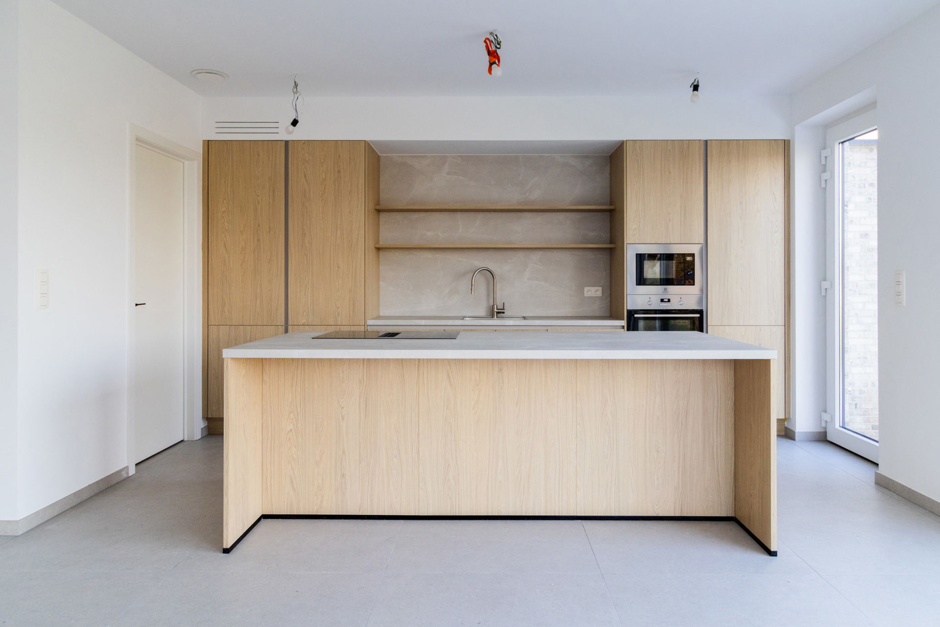 On the ground floor: an entrance hall/staircase with a separate toilet room, a separate office room (11m²), a large & open living/dining room (45m²), a fully equipped open kitchen with island (12m²) and adjoining a closed storage room (9m²).