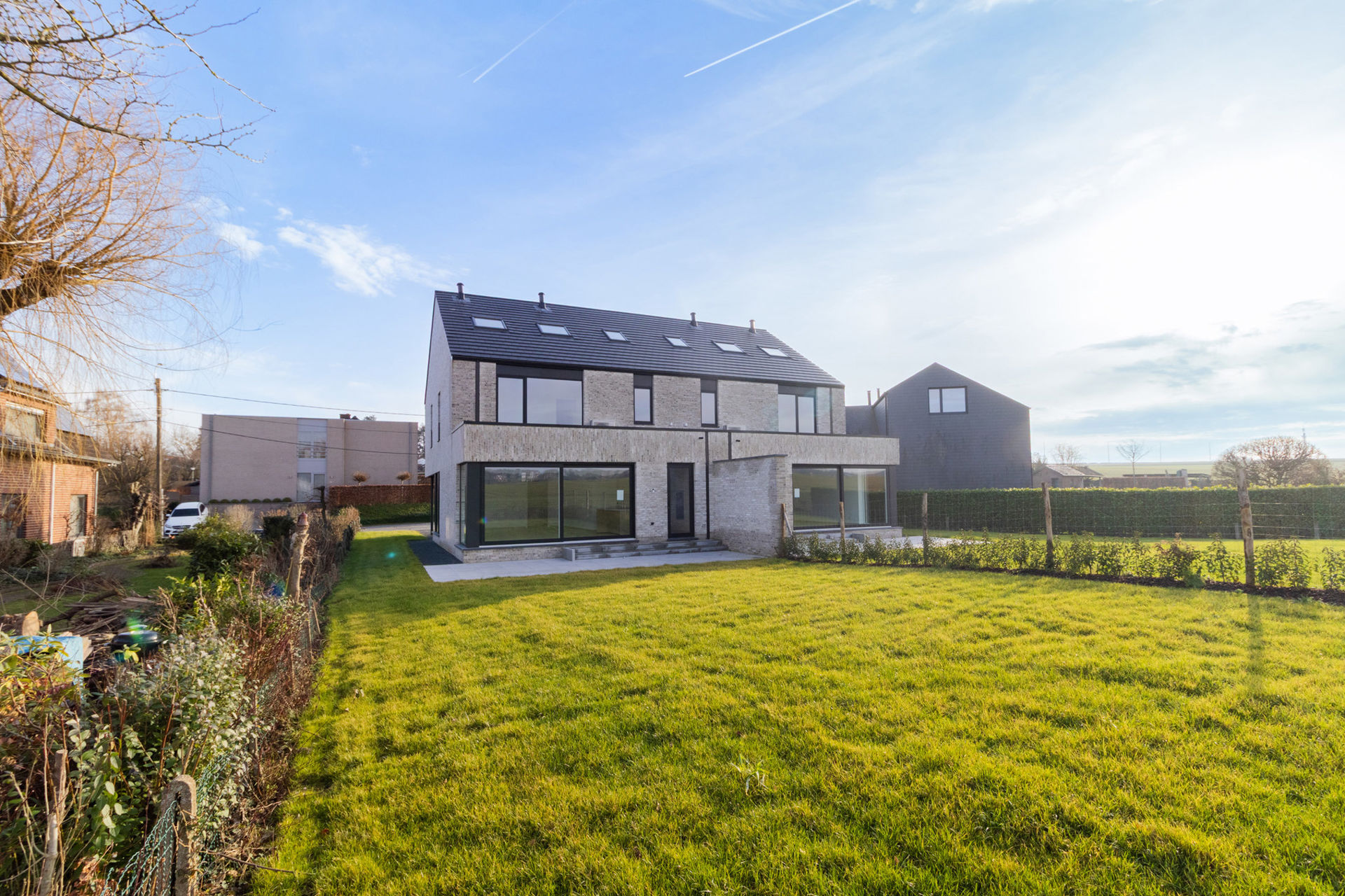 Very spacious new three-façade house (263m² built surface) with a total of 5/6 bedrooms and 1/2 office(s), on a beautiful plot of 4a 33ca, located in a small residential area with local traffic, and along the garden side a view over the fields. The house is divided as follows: