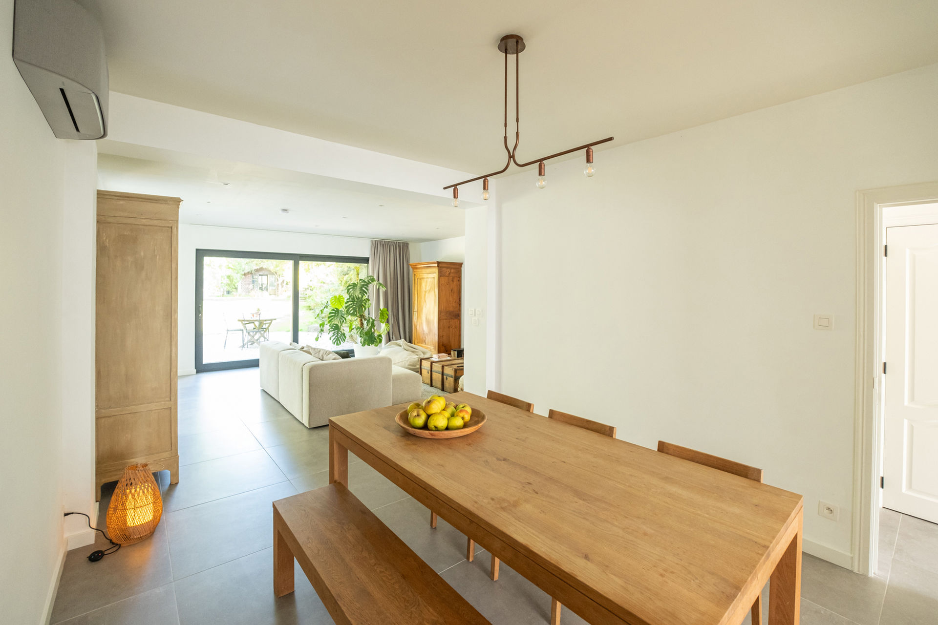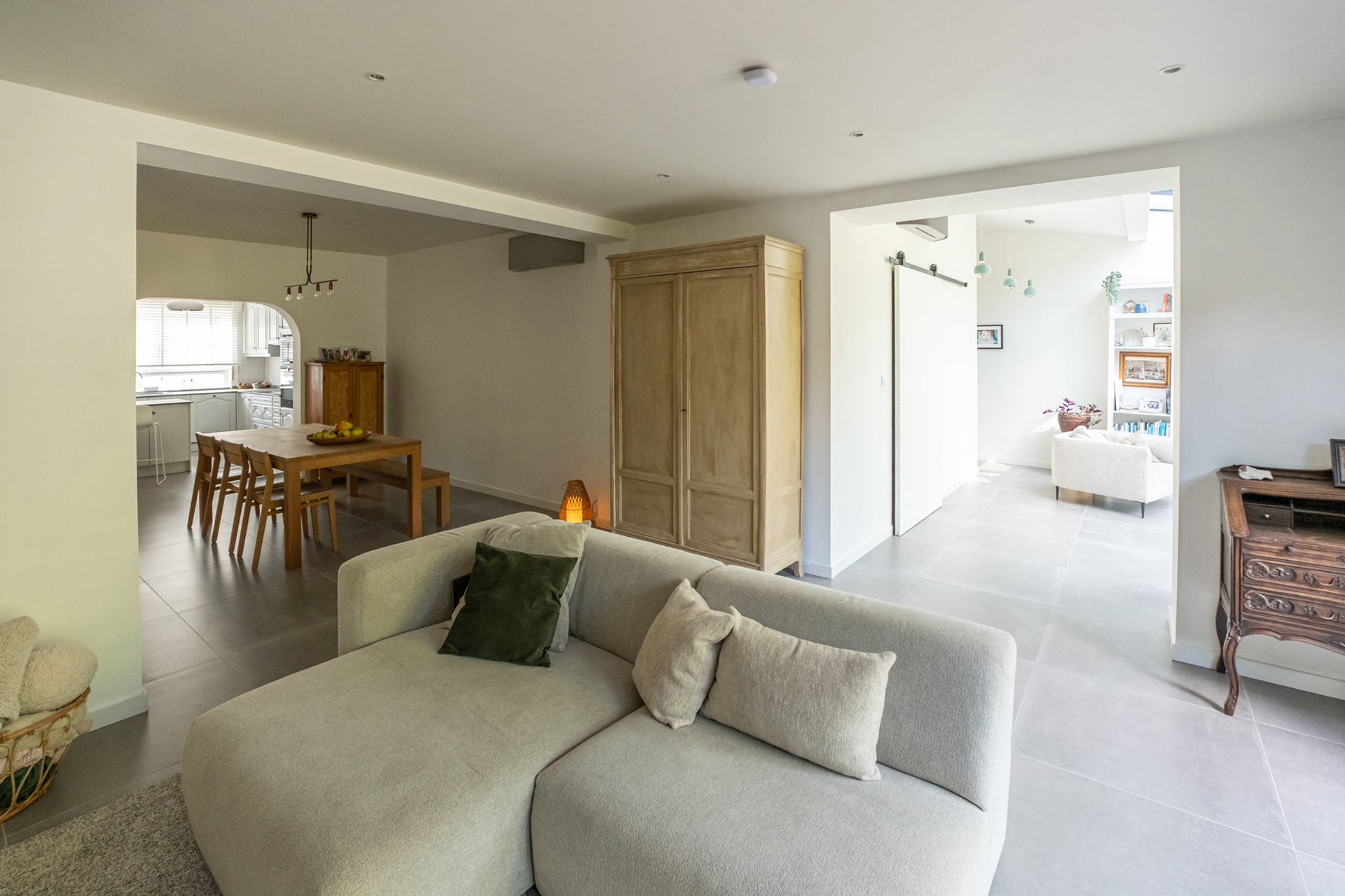 The entrance hall with cloakroom and storage leads to a fully equipped kitchen, a welcoming dining area, and a bright living room with an adjoining orangery. The newly built section features a spacious multi-purpose area with a separate entrance – ideal as an atelier, office, practice space, multi-generational living area, or even for an Airbnb concept.