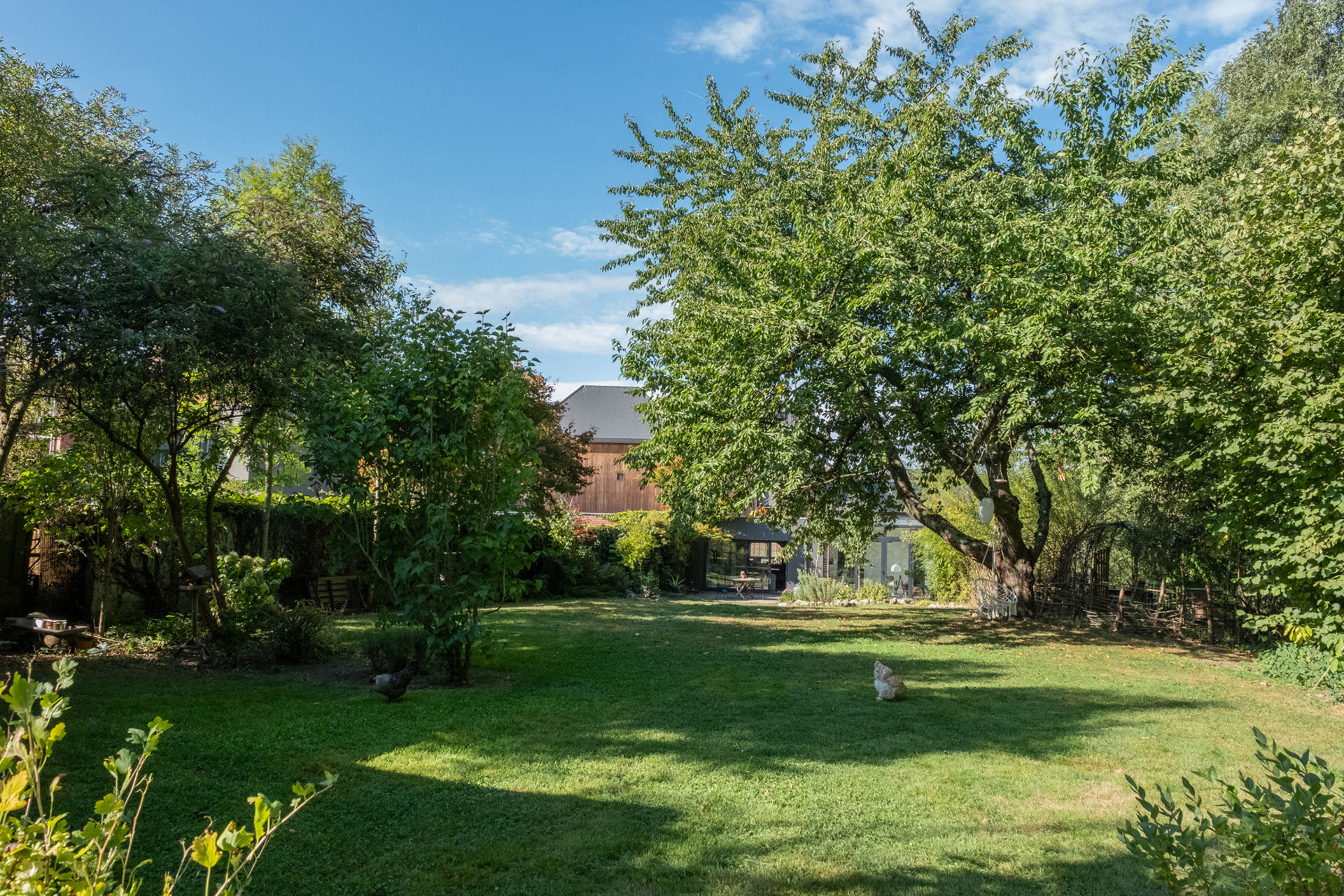 The first floor hosts two bedrooms, a compact dressing area, and a stylish bathroom. On the top floor, you’ll find a generous third bedroom with built-in wardrobes. The property also includes a partial cellar and a large garden filled with fruit trees, perfect for relaxing outdoors. Several parking spaces are available next to the house.