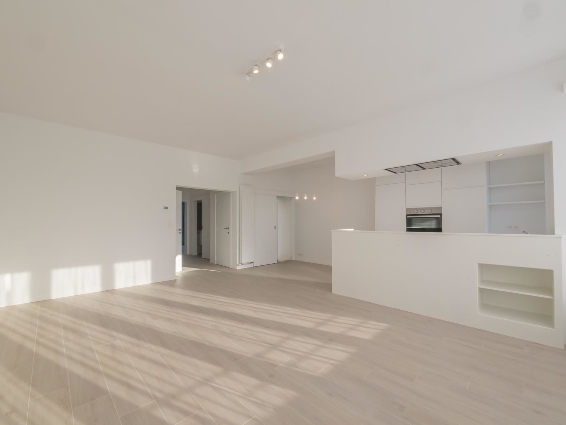 STOCKEL: Beautiful recent apartment located few steps to shops and transport of the Place Dumon. The apartment consists of an entrance hall with toilets, a bright living room of 30m², a fully equipped American kitchen (8m²), 2 bedrooms (15 & 11m²),a bathroom (6m²) and a balcony. Laundry (with washing machine and dryer) & a cellar of 14m2. Dubble glas, individual heating on gaz, curtains and lights. 2 cars garage in option: 150 €/month. To see quickly !!!
