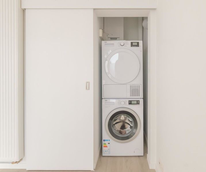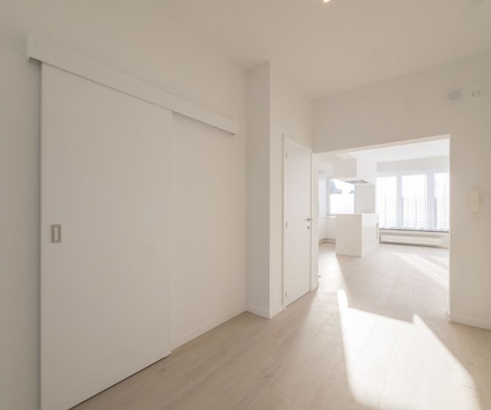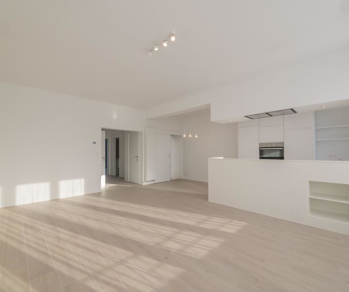 STOCKEL: Beautiful recent apartment located few steps to shops and transport of the Place Dumon. The apartment consists of an entrance hall with toilets, a bright living room of 30m², a fully equipped American kitchen (8m²), 2 bedrooms (15 & 11m²),a bathroom (6m²) and a balcony. Laundry (with washing machine and dryer) & a cellar of 14m2. Dubble glas, individual heating on gaz, curtains and lights. 2 cars garage in option: 150 €/month. To see quickly !!!