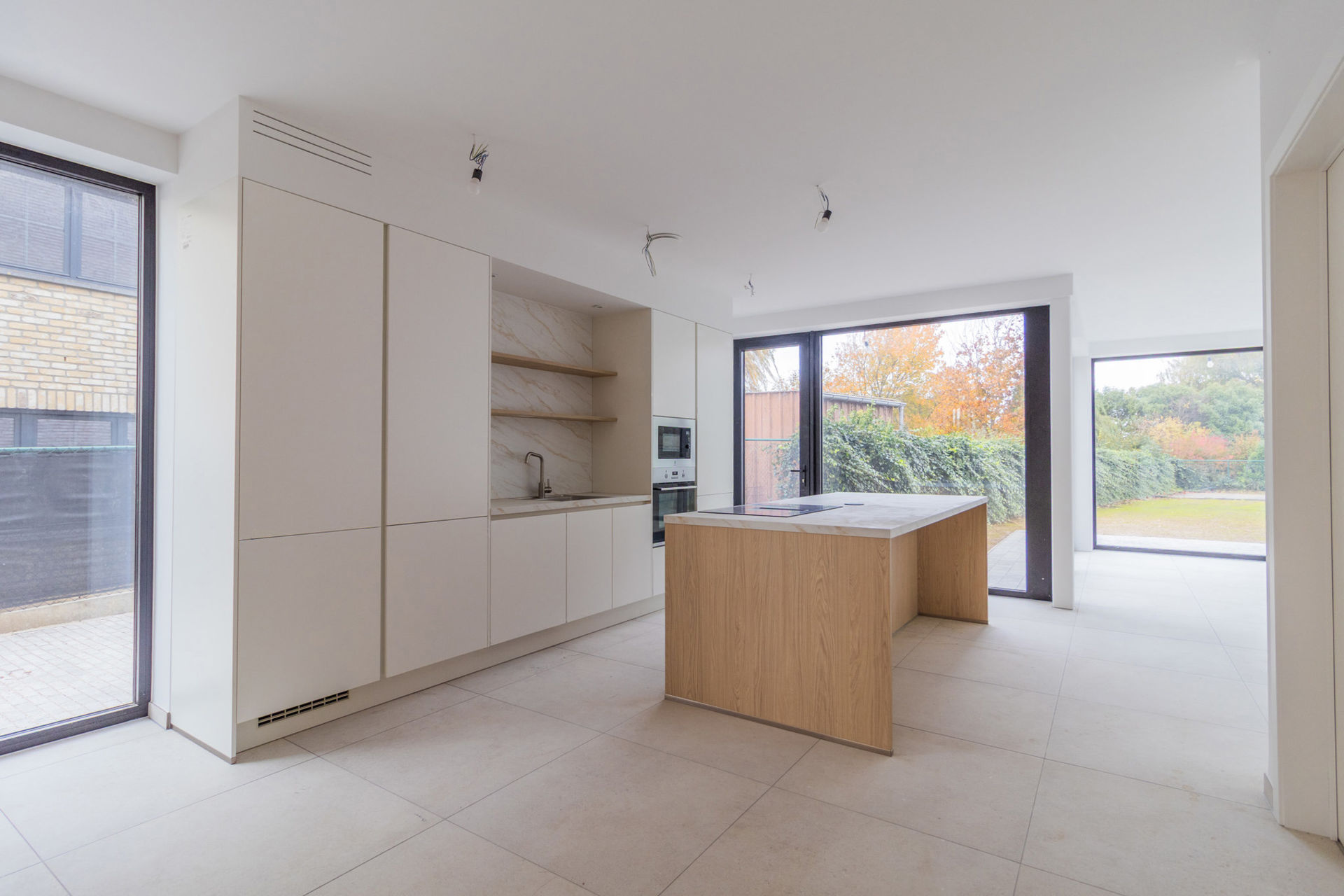 Ground floor: an elegant entrance hall/stairwell with separate toilet and space for a cloakroom, an open sitting area connected to a fully equipped kitchen with island, an adjoining dining area, and an additional reading corner.