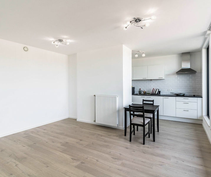 HAREN - Recent penthouse apartment, excellently located near major access roads, airport, public transport and shops. The apartment is located on the third floor and has an entrance hall with WC, a living room, an open kitchen with storage / laundry room, a bedroom, a shower room and a very spacious terrace. Underground garagebox mandatory to let for ? 75/month. Recommended!