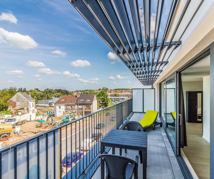 HAREN - Recent penthouse apartment, excellently located near major access roads, airport, public transport and shops. The apartment is located on the third floor and has an entrance hall with WC, a living room, an open kitchen with storage / laundry room, a bedroom, a shower room and a very spacious terrace. Underground garagebox mandatory to let for ? 75/month. Recommended!