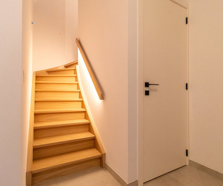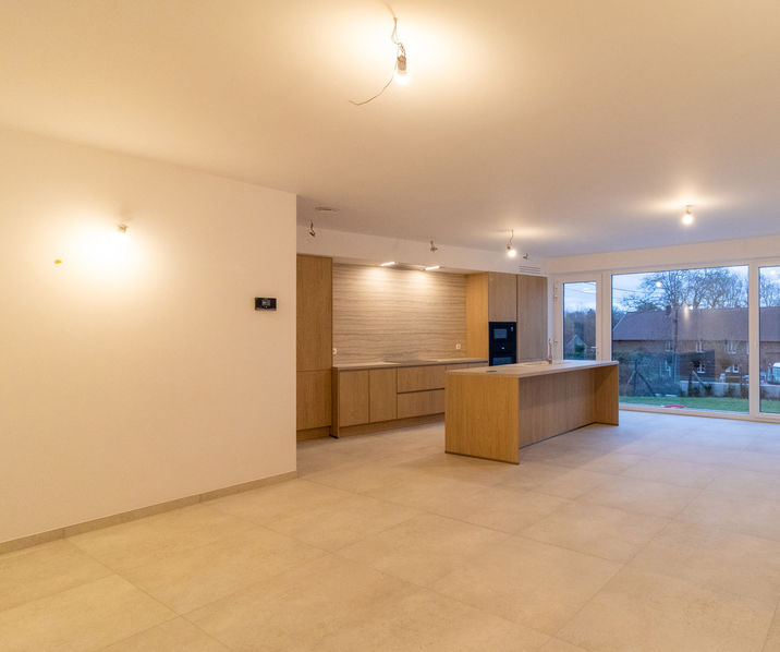Au rez-de-chaussée, la maison est agencée comme suit : un hall d'entrée avec des toilettes séparées et un espace pour un vestiaire, un beau et spacieux salon/salle à manger (43,5 m²) avec une cuisine ouverte entièrement équipée, un grand débarras/buanderie séparé (8 m²), une belle et spacieuse terrasse et un accès au jardin.