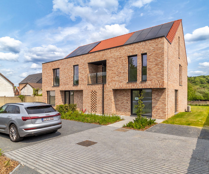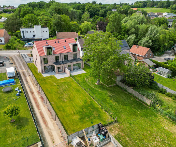 Huldenberg (Loonbeek) : Très spacieuse maison neuve trois façades (253 m² de surface bâtie) comprenant au total 4 à 5 chambres et 1 à 2 bureaux, implantée sur un beau terrain de 6 ares 71 centiares, dans un environnement rural et offrant, côté jardin (orientation sud-est), une vue dégagée sur la verdure.