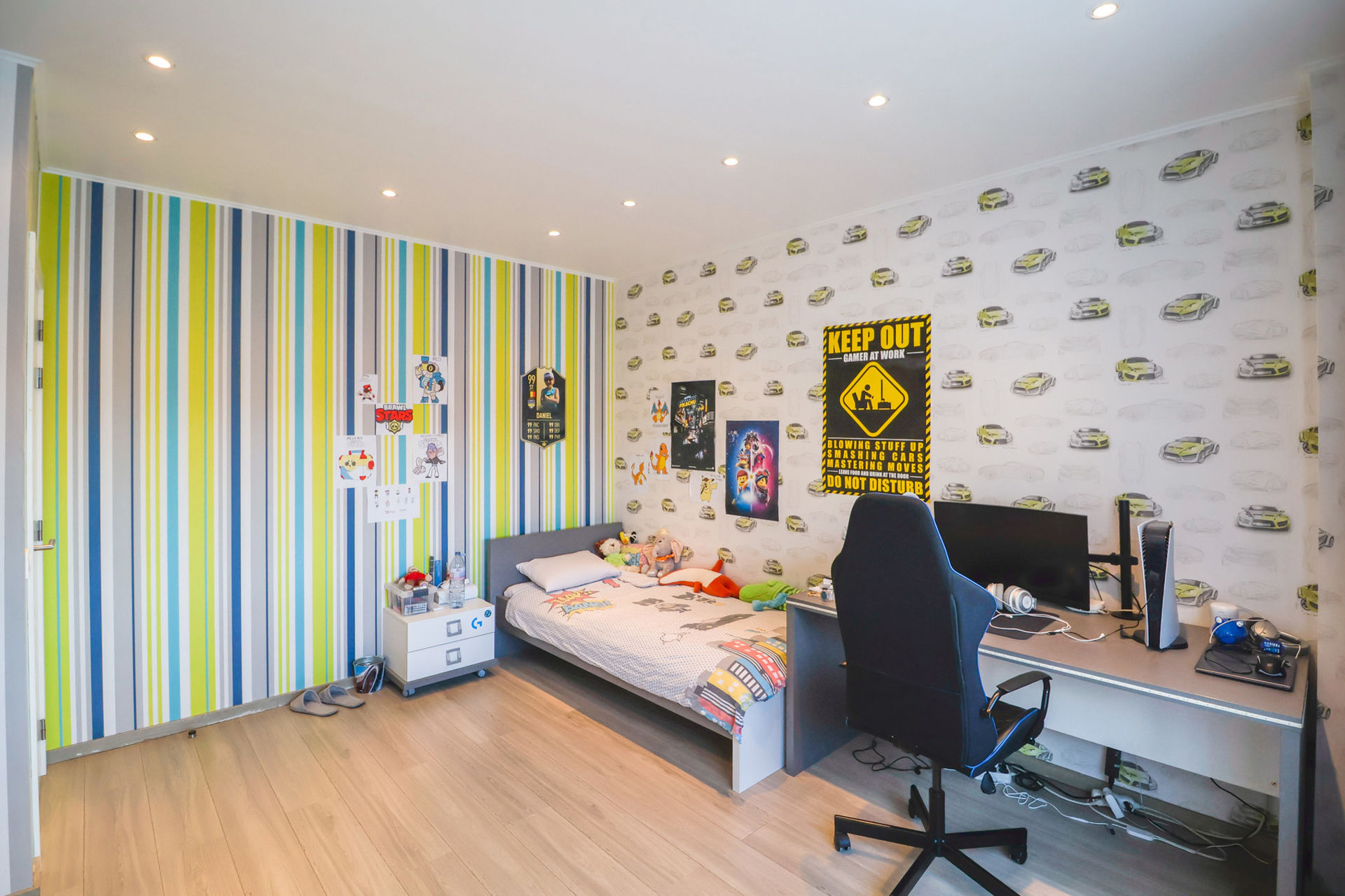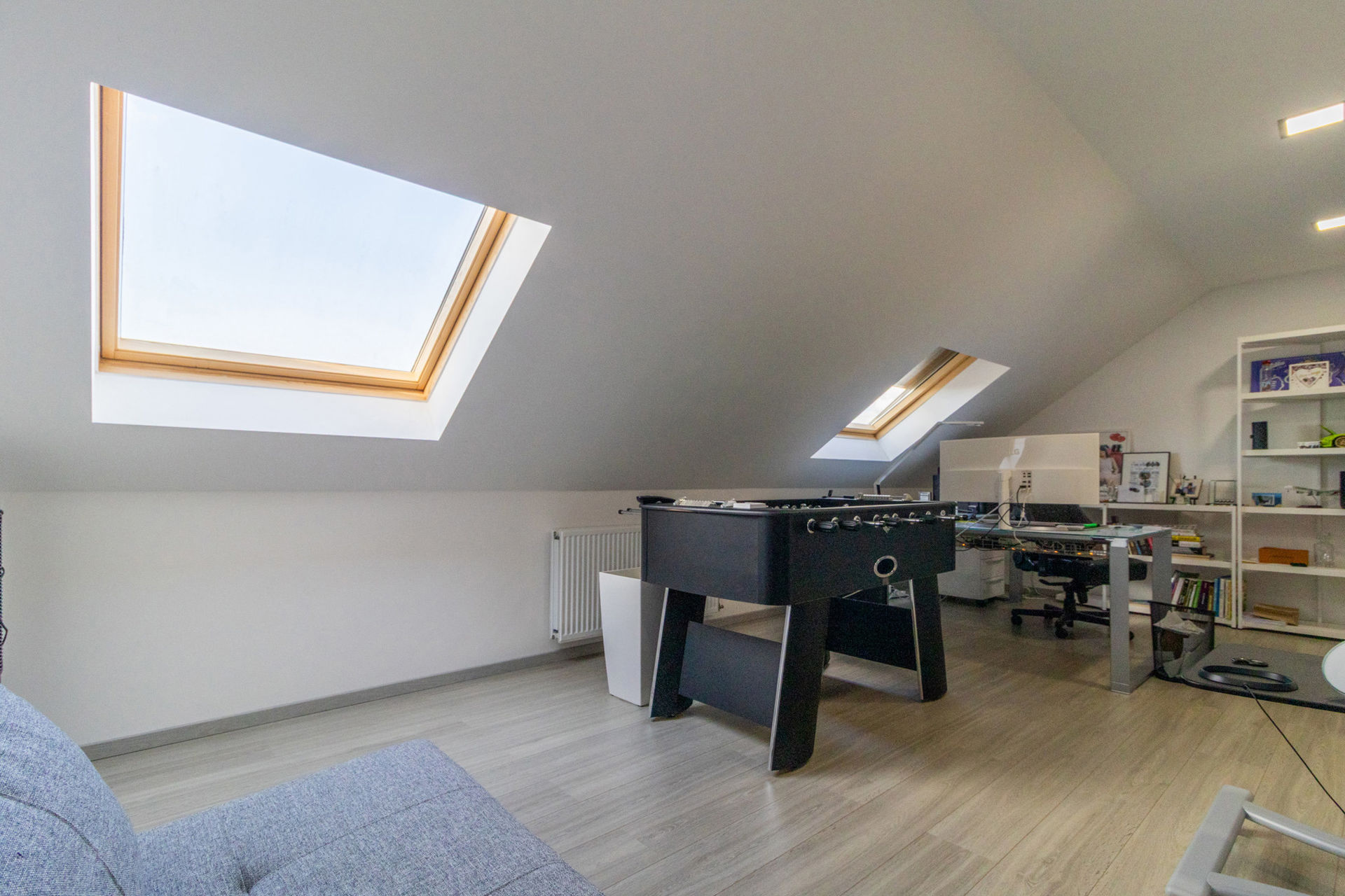 Au 2ème étage (en partie sous la pente du toit) se trouvent 2 grandes chambres (27-17m²) qui servent actuellement de bureau et de salle de loisirs/salle de sport. Il y a également une salle de bain supplémentaire.