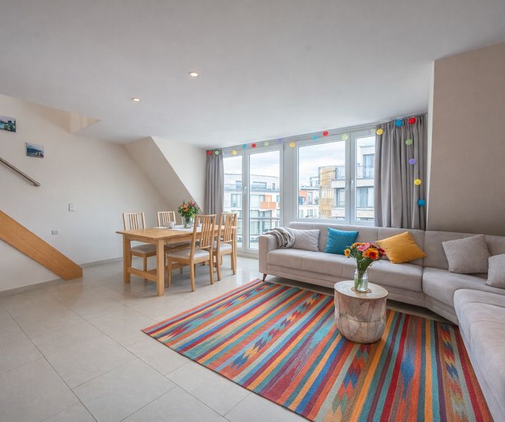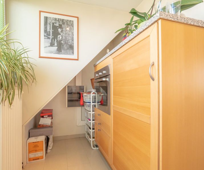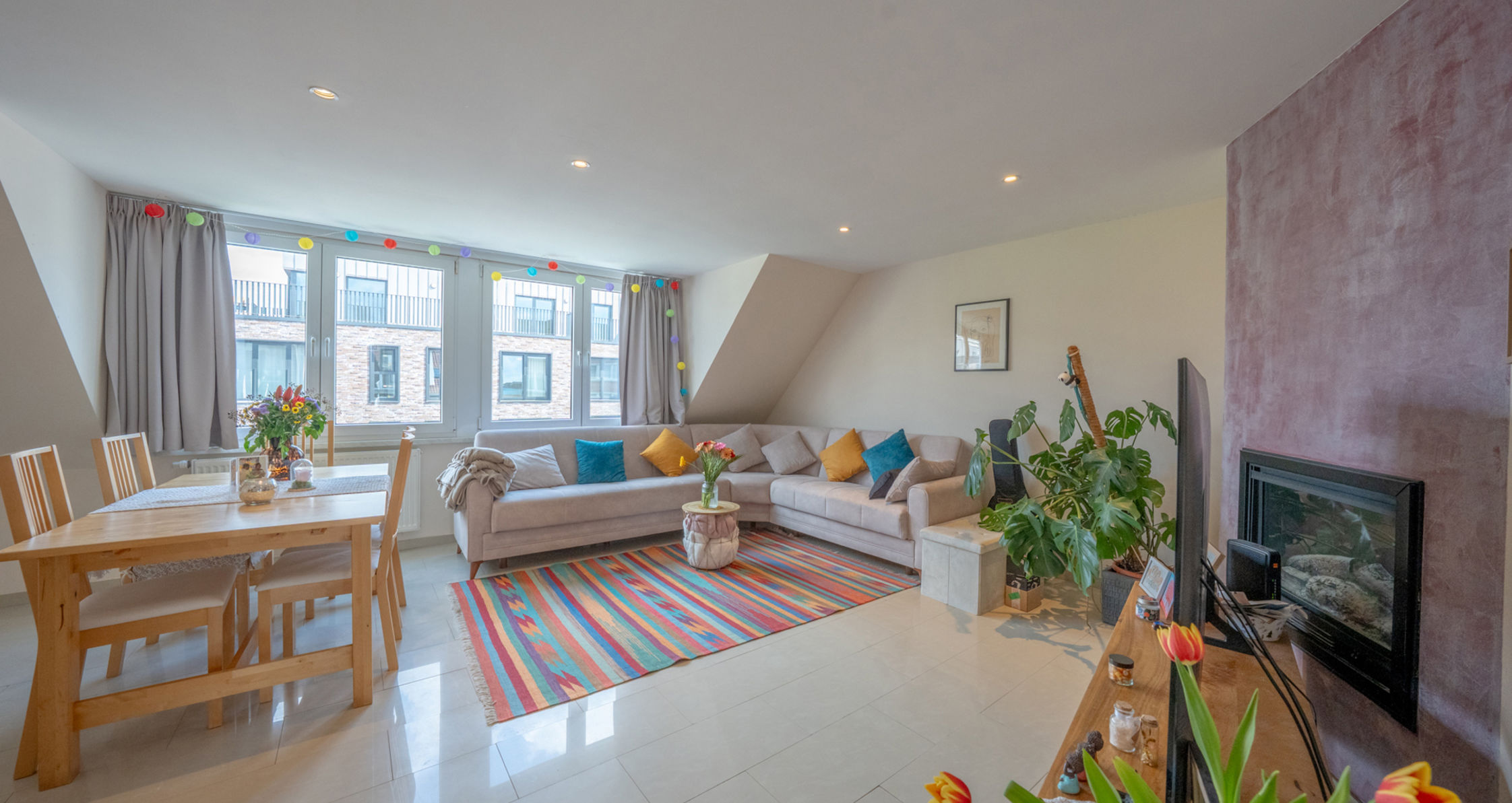 EVERE: Superbe duplex rénové de 80 m2 situé dans quartier calme à proximité des commerces, de l'Otan, des grands axes et des transports en commun. L'appartement se compose d'un hall d'entrée avec wc, d'un living avec feux ouvert décoratif (28m2), une cuisine full équipée (8m2) donnant sur une terrasse en tek plein sud (11 m2). A l'étage, une chambre avec dressing (11m2), salle de douche avec fonction massage, double évier et wc. Chauffage individuel au gaz (basse consommation) + cave. Eau: 25?/mois. Pas de charges communes. A voir: belles finitions, très lumineux !!!