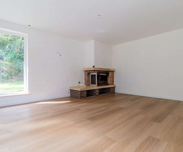 Au premier étage : un hall d?entrée, un beau et spacieux séjour (27 m²) avec cheminée et accès à une terrasse couverte, une cuisine ouverte entièrement équipée (8,5 m²) donnant sur une salle à manger ouverte (12 m²), un WC séparé, 2 grandes chambres (13,5 ? 11,5 m²) et une salle de bain (baignoire et lavabo). Le salon donne accès au jardin, qui offre une belle intimité grâce au petit bois appartenant à la commune.