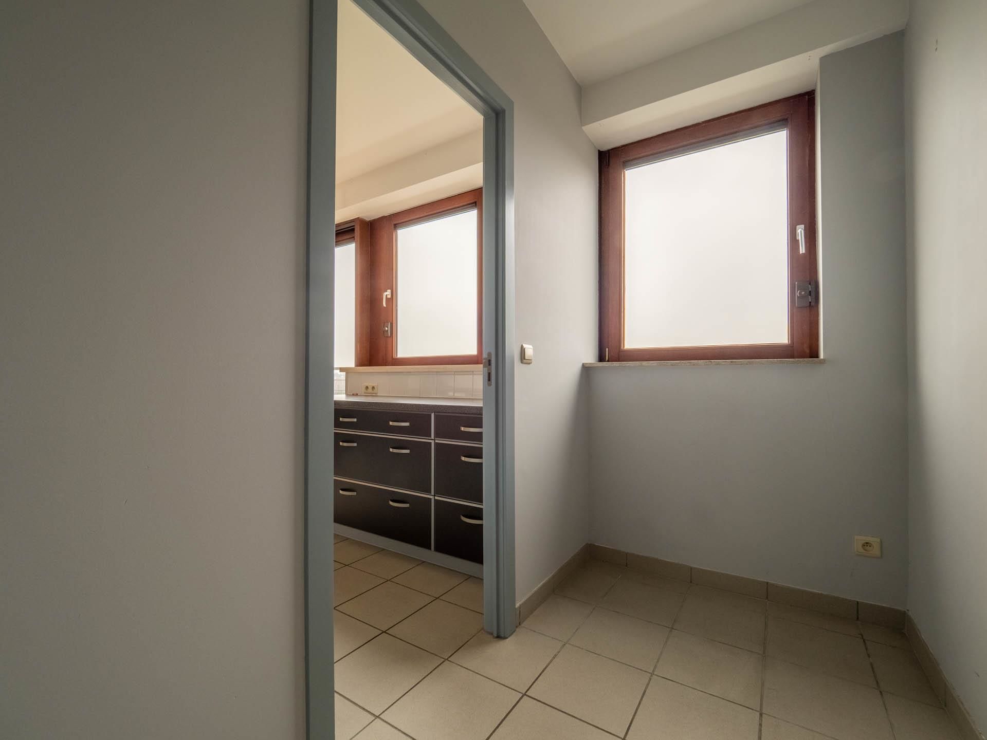 Het appartement bestaat uit een hal met toilet en garderobe, een lichte woonkamer (30m2) met toegang tot het op het oosten gelegen terras (18m2) met uitzicht op de voetbalclub van Stockel, een super uitgeruste keuken (8m2), een wasruimte, een grote slaapkamer die kan worden gescheiden en ideaal is voor kantoorruimte (25m2), een badkamer met douche (5m2).