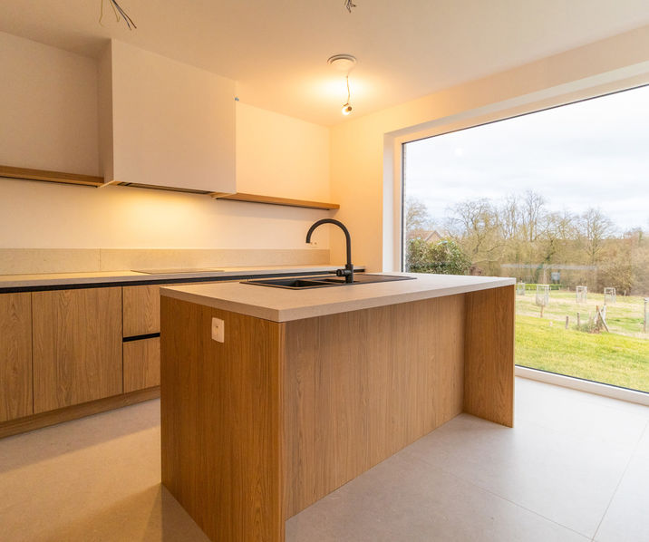 ingerichte keuken met kookeiland (12 m²), een grote, aparte berging/wasplaats (11m²), een mooi & ruim terras en toegang tot de tuin.