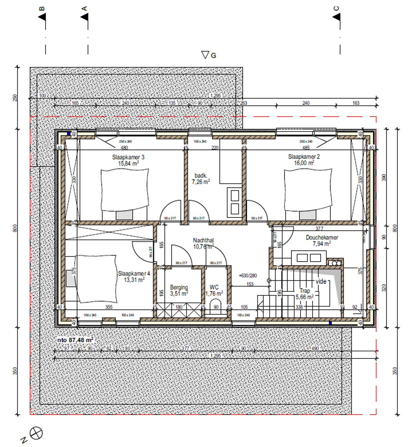 -op de 2de verdieping: een grote nachthal/traphal, 3 ruime slaapkamers (16-16-13 m²), een wc-lokaal, een berging, een badkamer (7m², bad, 2 wastafels) en een douchekamer (8m², inloopdouche, 2 wastafels).