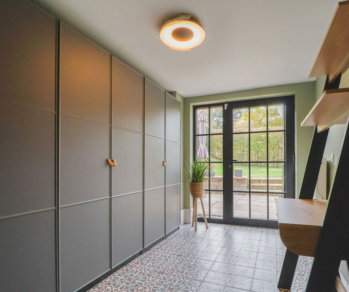 Bij het betreden van de woning word je verwelkomd in een ruime inkomhal met gastentoilet. De garage biedt voldoende ruimte voor één wagen en directe toegang tot een praktische wasplaats. Daarnaast is er een extra polyvalente ruimte, perfect als bureau, speelkamer of hobbyruimte, met uitzicht en directe toegang tot de zonnige tuin ? ideaal voor zowel werk als ontspanning.