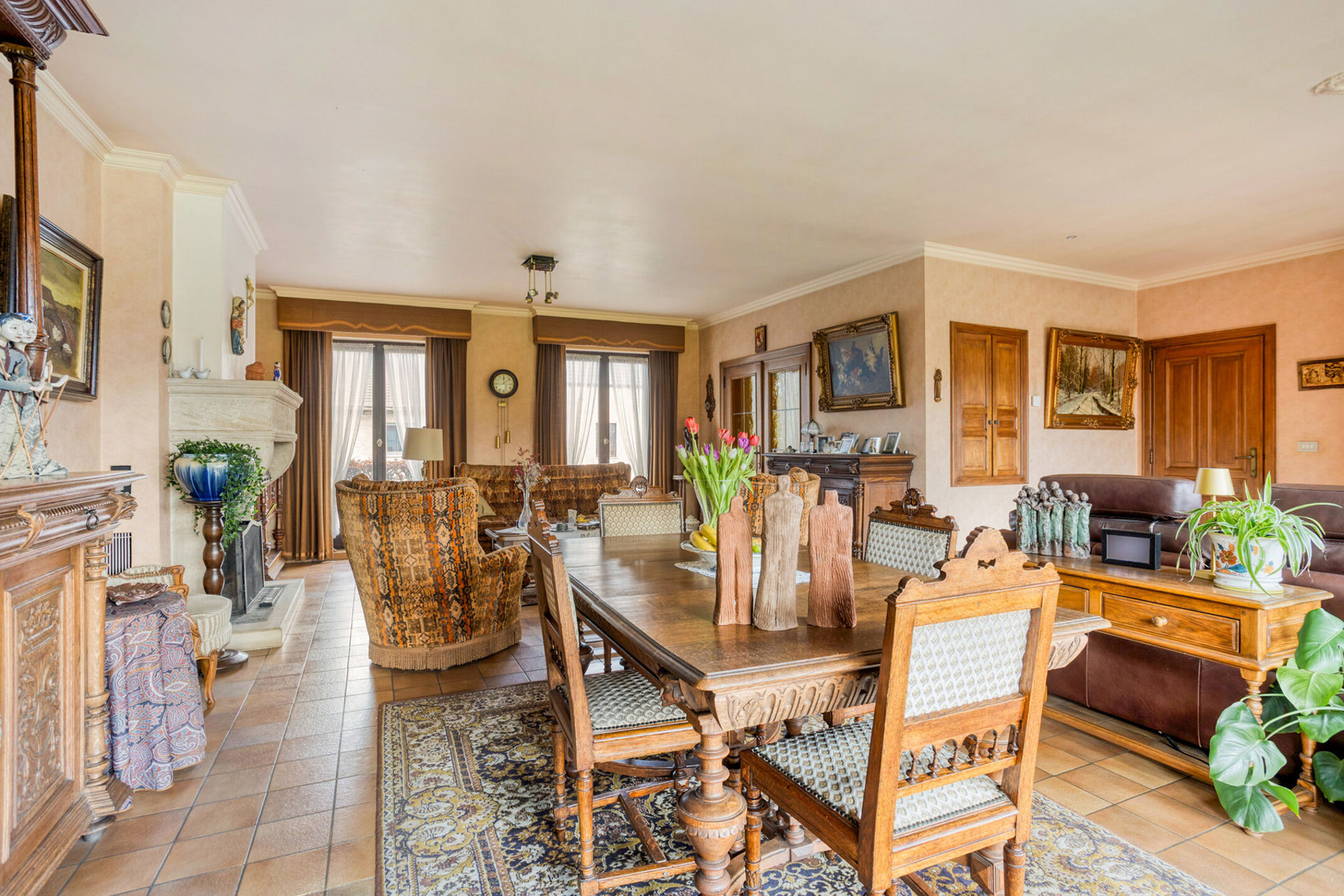 Bij het betreden van de woning word je verwelkomd in een royale inkomhal met vestiaire, die meteen een gevoel van ruimte en klasse uitstraalt. Het gelijkvloers biedt een lichtrijke woon- en eetkamer van circa 50 m² met open haard, ideaal voor gezellige familiemomenten. Aansluitend bevindt zich de volledig ingerichte keuken met eethoek van 23 m². Verder zijn er op dit niveau nog een afzonderlijk bureau en een gastentoilet.
