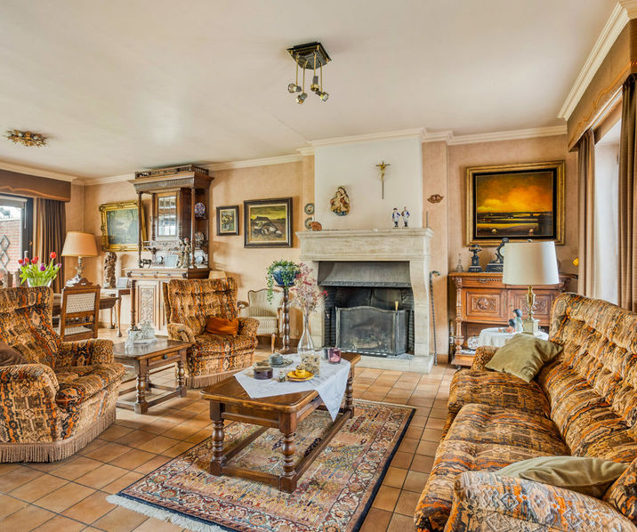 Bij het betreden van de woning word je verwelkomd in een royale inkomhal met vestiaire, die meteen een gevoel van ruimte en klasse uitstraalt. Het gelijkvloers biedt een lichtrijke woon- en eetkamer van circa 50 m² met open haard, ideaal voor gezellige familiemomenten. Aansluitend bevindt zich de volledig ingerichte keuken met eethoek van 23 m². Verder zijn er op dit niveau nog een afzonderlijk bureau en een gastentoilet.