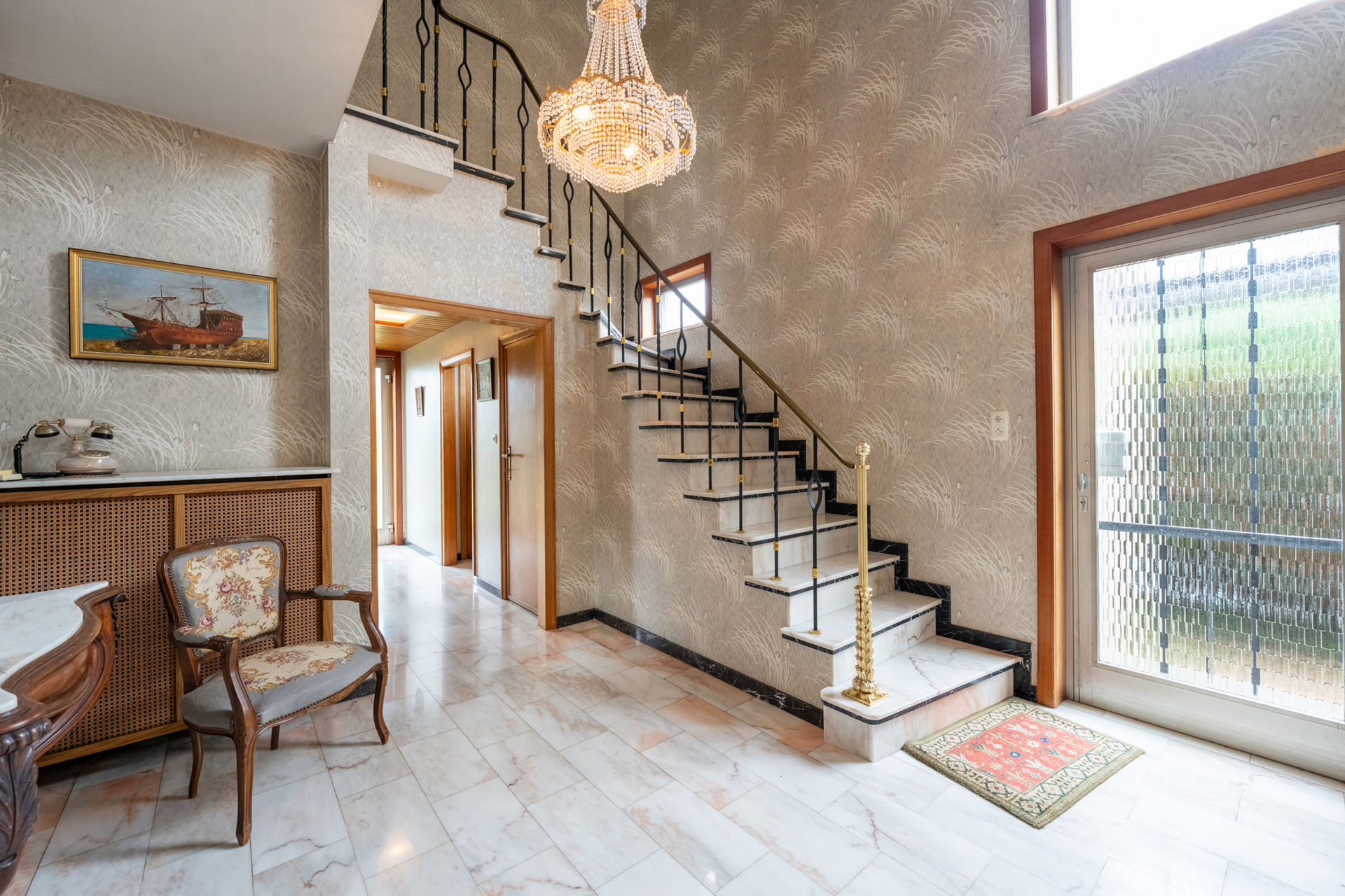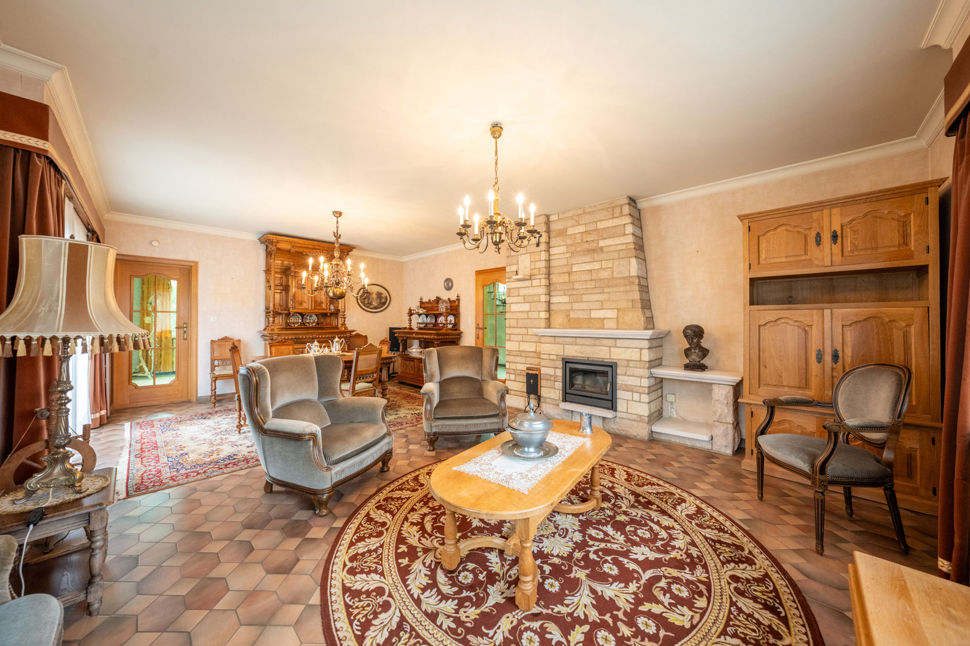 - Gelijkvloers : ruime inkomhal met WC en vestiaire, lichtrijke woonkamer met open haard (35 m²), keuken met ontbijthoek (21 m²) en bureau (10 m²).
