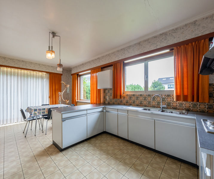 - Gelijkvloers : ruime inkomhal met WC en vestiaire, lichtrijke woonkamer met open haard (35 mē), keuken met ontbijthoek (21 mē) en bureau (10 mē).